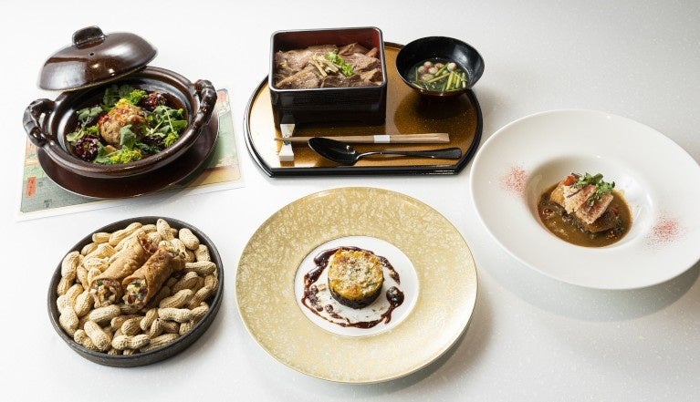 山の姿や形・川の流れる様子を表す「山容水態」と、日本の食文化「発酵」を合わせ、サステナブルな千葉の里山を表現しました。海から山に養分を運ぶ「鮎」、その養分で育つ「猪」や「野菜」のイメージで食材をチョイスし、自然のサイクルがある豊かな千葉の食材と日本の食文化が未来に続くようにと思いを込めた一品です。