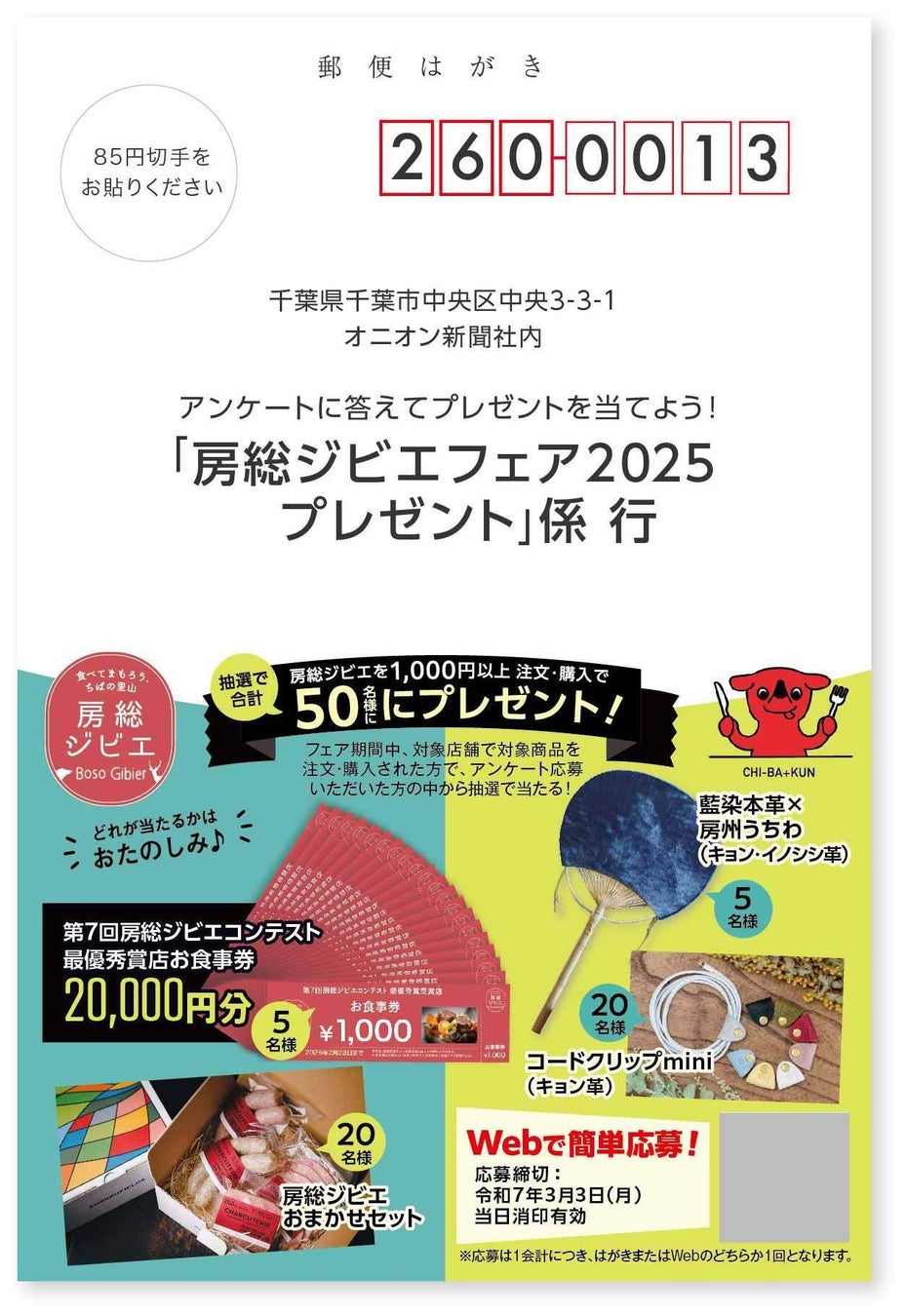 フェア対象店舗で対象の房総ジビエ料理や商品を1,000円以上注文・購入し、応募された方の中から、抽選で50名に県産品等をプレゼントします。