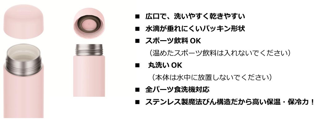 本製品は、当社のケータイマグとして初めて、水筒の内面に“セラクリーンコート”を採用しました。汚れが落ちやすく乾きやすい特長を持ち、日常のお手入れが簡単になります。さらに水筒内側のソコの丸みを大きく、飲み口部分を広口形状にすることで、手洗い時の洗いやすさが向上しています。また、全パーツが食洗機に対応しており、日常の食器類と一緒に手軽で快適なお手入れが可能です。