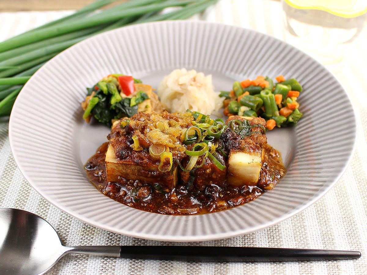 副菜は、菜の花と干し肉のあえ物、ツナの入った大根サラダ、インゲンのXO醤です。