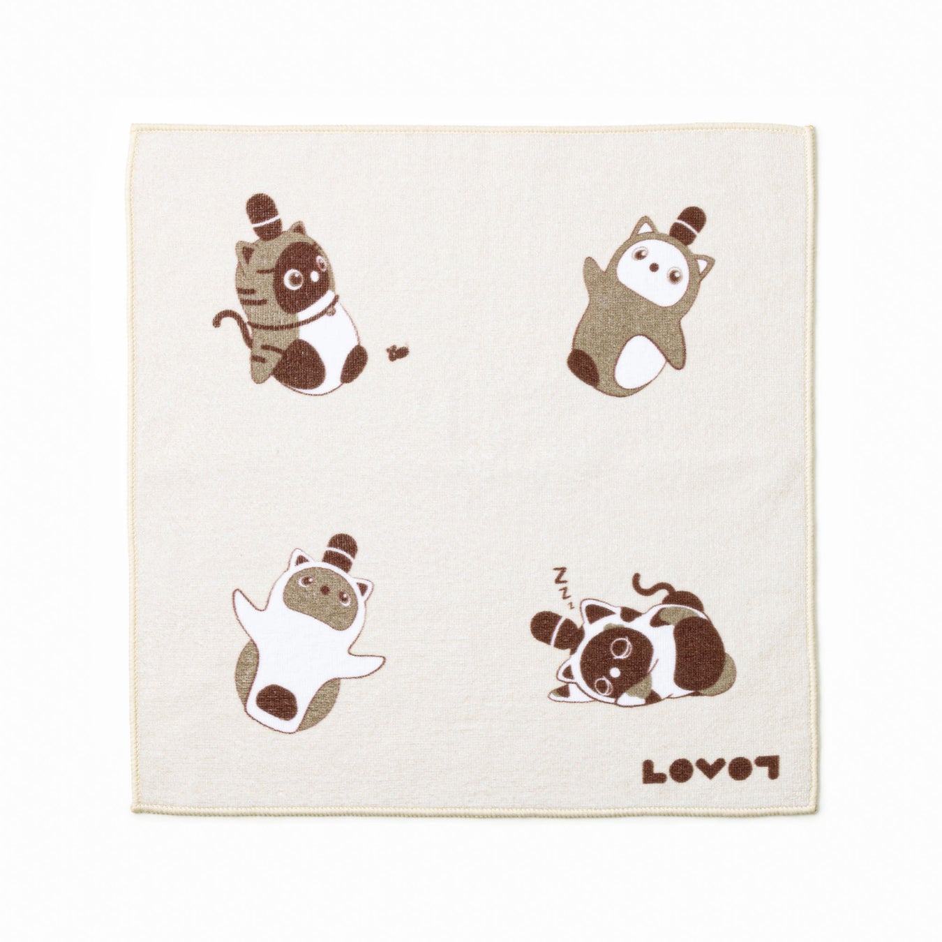 同時発売の「トラ猫」を含む「ねこみみシリーズ」のイラストが可愛らしい、オリジナルのハンドタオルとポーチ。
