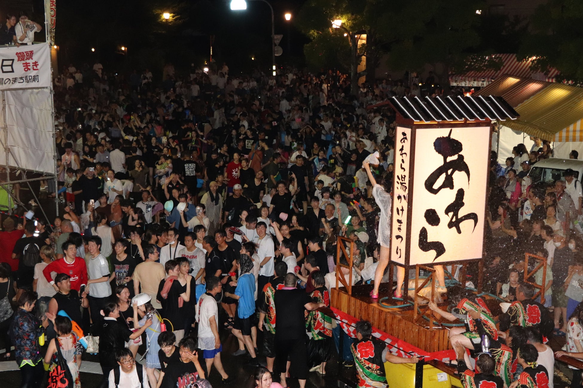 夜には、あわら湯のまち駅前ロータリー周辺が湯かけ会場となり、祭りはクライマックスをむかえます。
