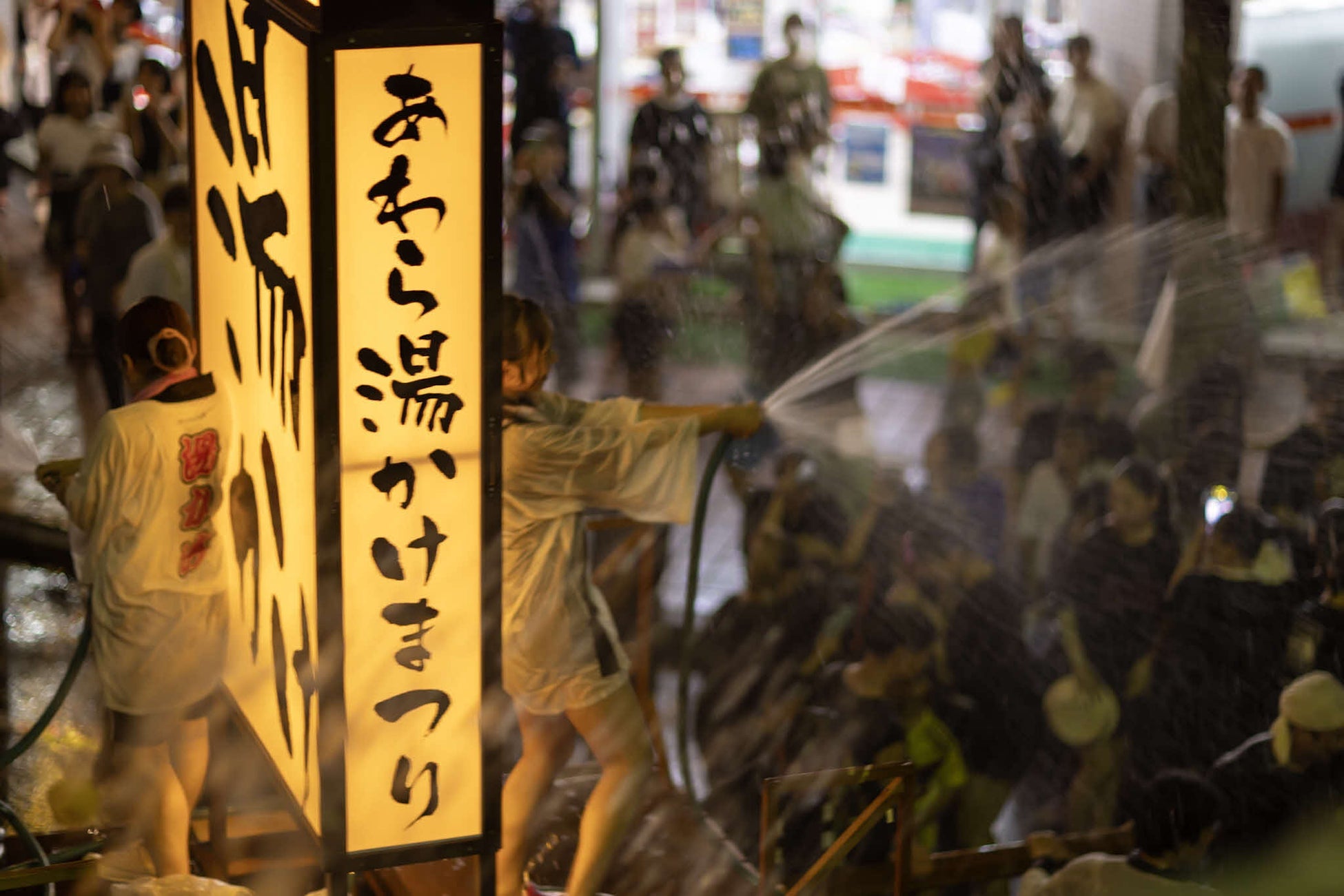 温泉街の住民も観光客も一緒になって、お湯をかけ合って盛り上がります。