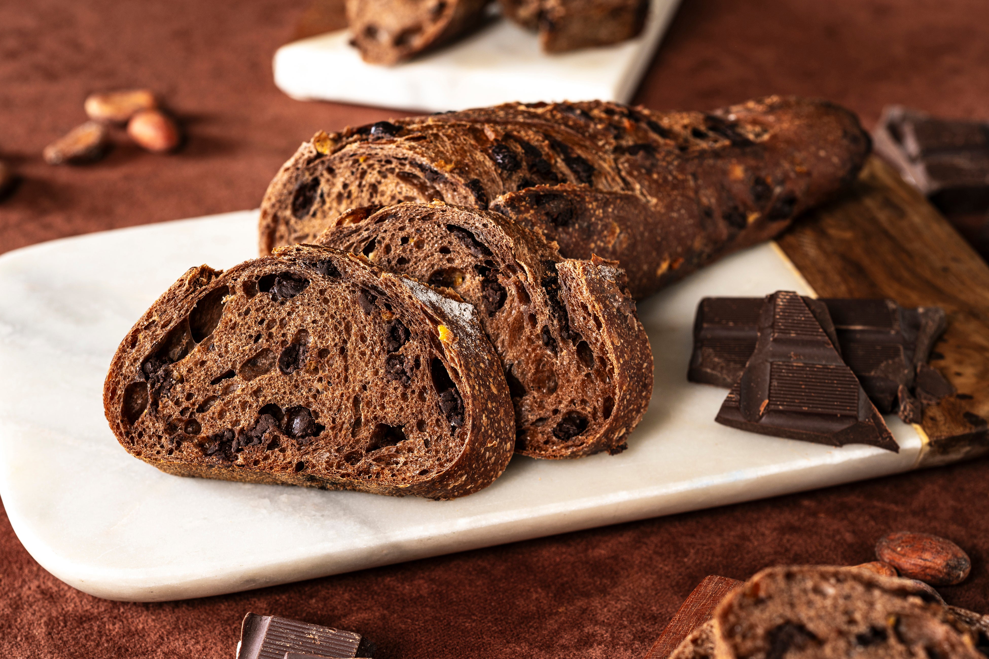 ■内容:フランスパン生地にココアパウダー、チョコチップ、オレンジピールを贅沢に練り込み、香ばしく焼き上げました。甘さと酸味のバランスが楽しめる風味豊かな仕上がり。外はパリッと、中はしっとり、チョコレートとフルーツの香りが広がる、贅沢な味わいのバゲットです。