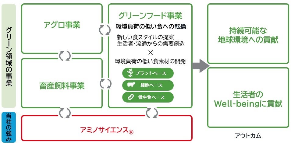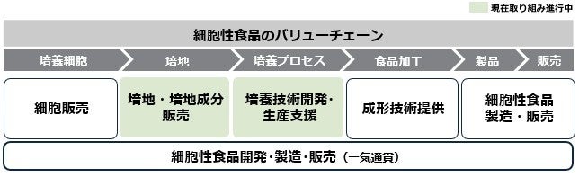 当社は「アミノサイエンス®で、人・社会・地球のWell-beingに貢献する」という志(パーパス)の下、中期ASV経営 2030ロードマップにおいて、市場の成長性と社会価値の高い4つの重点成長領域で飛躍的成長を目指す基本方針を掲げています。本技術の開発はその一つ、グリーン領域の中核となるグリーンフード事業を加速させる環境負荷の低い食素材の開発活動として位置づけられます(図2)。細胞性食品のバリューチェーンの中には、細胞そのものの販売をはじめ、培地や成長因子等の培地成分の販売、それらを使った培養技術開発・生産支援サービス、さらには食品加工、細胞性食品の製造・販売に至るまで複数のプロセスが存在し、当社にも多様な事業機会が広がっています。それらいずれも当社の強みであるアミノサイエンス®が十分生かせる分野であり、まずはバイオ医薬/再生医療用培地事業で培った技術と知見を活用し、培地・培地成分販売や培養技術開発・生産支援での事業参入を目指します(図3)。当社は今後も細胞性食品の社会実装を支援し、持続可能なアグリフードシステムの構築に貢献します。
