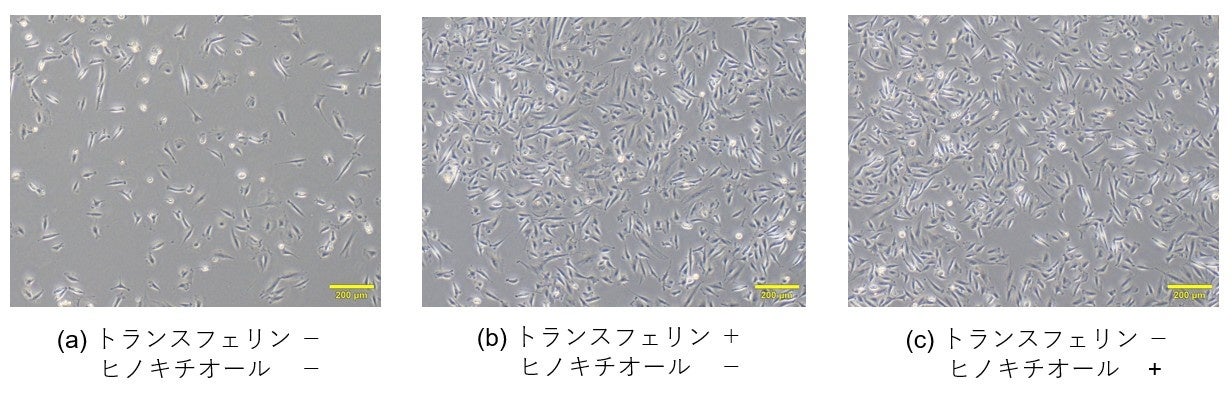 ヒノキチオールは、植物に含まれる天然成分で、鉄と結合して細胞内に鉄を届ける働きを持っています。この特性を生かすことで、従来トランスフェリンが持つ本機能を代替し、無血清培地で高い細胞増殖率を維持できることを確認しました(図1)。この研究成果は、2025年11月に開催されたInternational Scientific Conference on Cultured Meat (ISCCM)で発表しております。