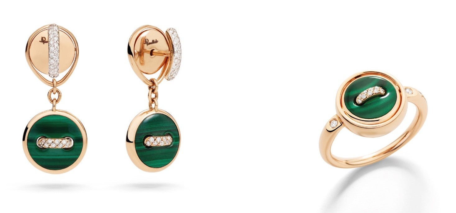 深いグリーンのマラカイトは、光沢あるホワイトとの魅力的な色彩を作り出し、誰も想像していなかったカラーコンビネーションへのポメラートのこだわりを表しています。この印象的な組み合わせは、新作のリバーシブルリングと革命的なドロップイヤリングでも生き生きと表現されています。洗練された構造により、簡単に異なるルックに変えることができます。ターコイズと同様に、これらのピースは多様性の愉快さを讃えています。マラカイトの深みあるドラマティックなカラーと、マザーオブパールの幻想的で儚い輝きを自在に楽しむことができるのです。