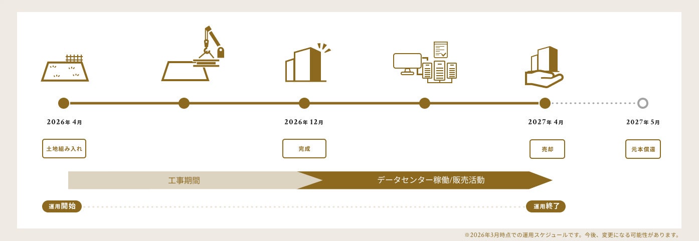 ファンド組成後、建築確認取得済みの対象土地を旧ファンドから組み入れ、建物建築を行います。建物は2026年12月に竣工予定です。運用期間終了までに土地建物を売却し、配当・元本償還を行います。また竣工後、運営会社である株式会社Unsung Fieldsと賃貸借契約を結び(フリーレント)、その後、同社は開業準備を行った後運営を開始します。データセンターの運営が開始されている中での販売活動とすることで、好条件での売却を狙っておりますが、既に当該不動産の売却先マーケティングを行っており、複数の有力な売却先候補があります。