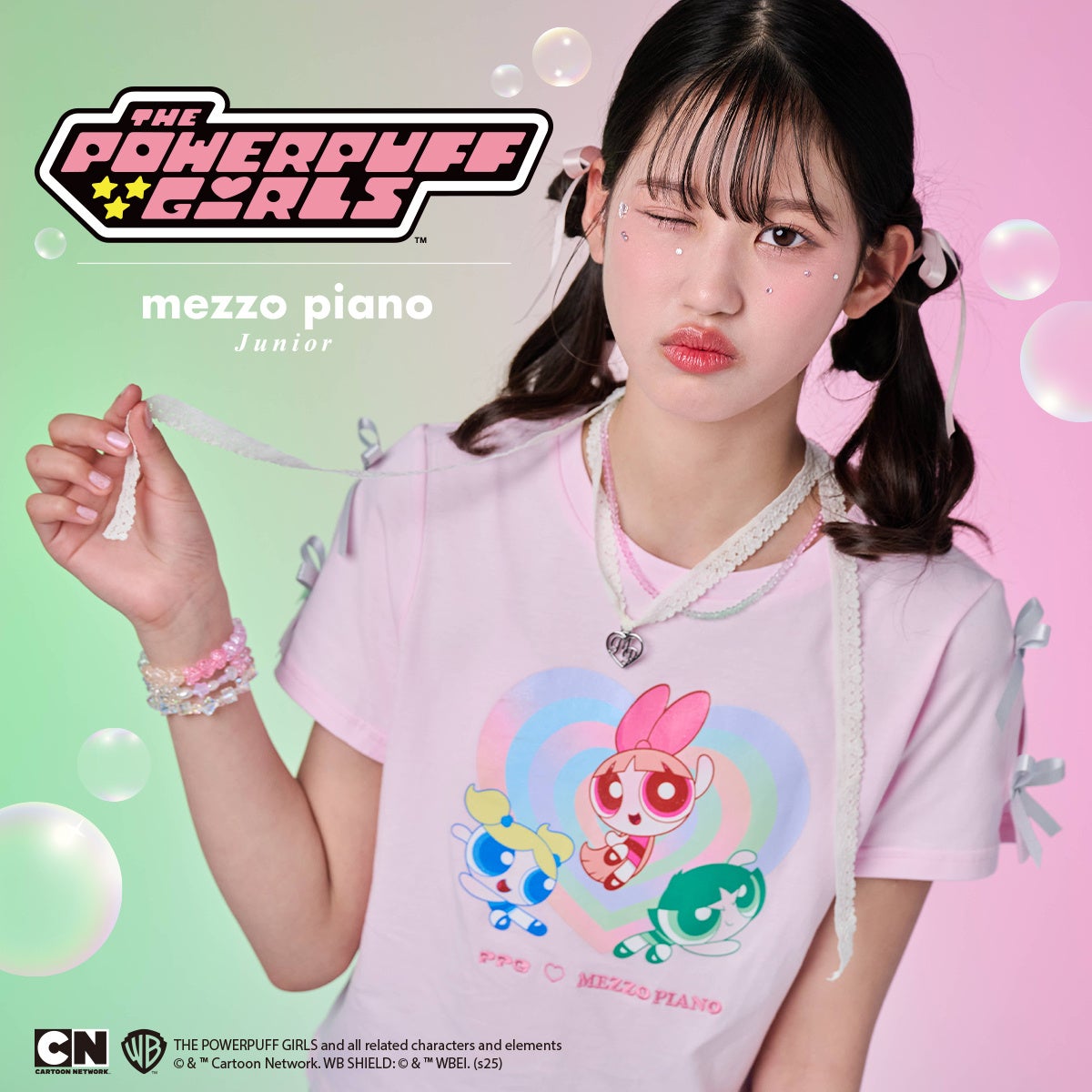 ブロッサム、バブルス、バターカップのグラフィックに、ラメプリントとリボン袖でメゾピアノジュニアらしいガーリーなエッセンスをプラス。