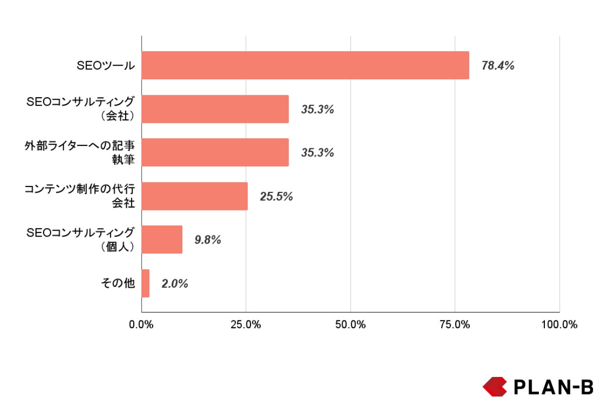 そのうち、SEOにまつわる費用の使用先として最も多いのは「SEOツール」で78.4%、次いで「SEOコンサルティング会社への依頼」、「外部ライターへの記事執筆」でそれぞれ35.3%となっています。