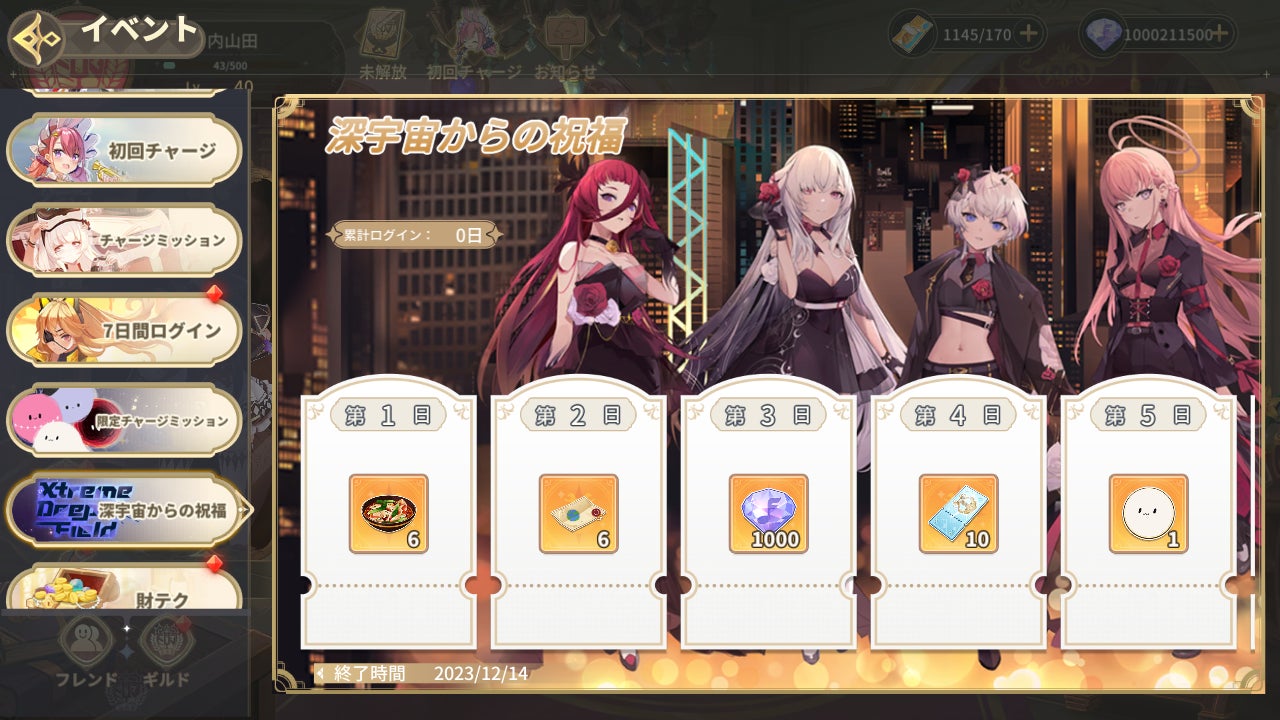 2023年11月30日(木)5:00から12月14日(木)4:59までの間、11日間ゲームにログインすると合計で無償ダイヤ2,000個分や、ガチャチケット30枚分などが手に入るログインイベント「深宇宙からの祝福」を開催します。