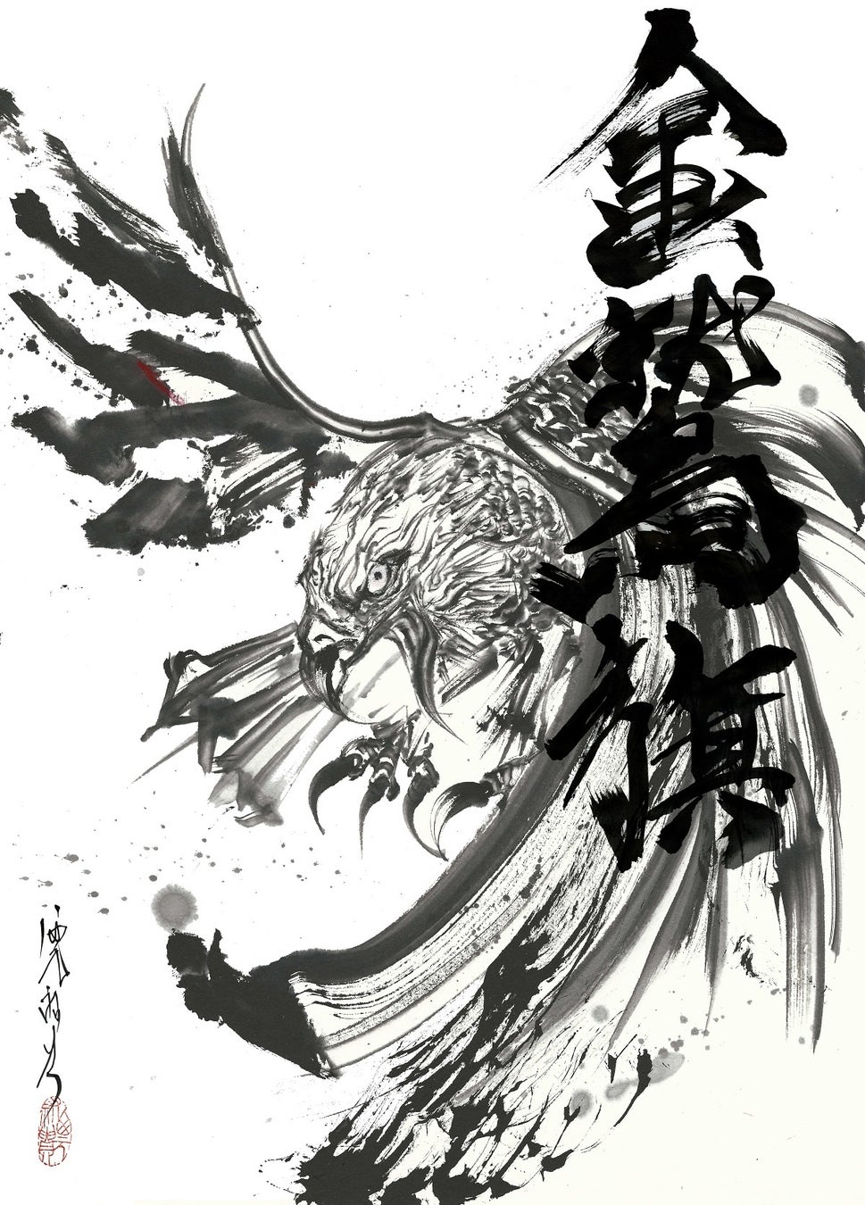 そんな西元が全国でも有名な大会でメインビジュアルを担当。今回は墨絵のみならず、「金鷲旗」と「玉竜旗」という筆文字も西元が書きました。