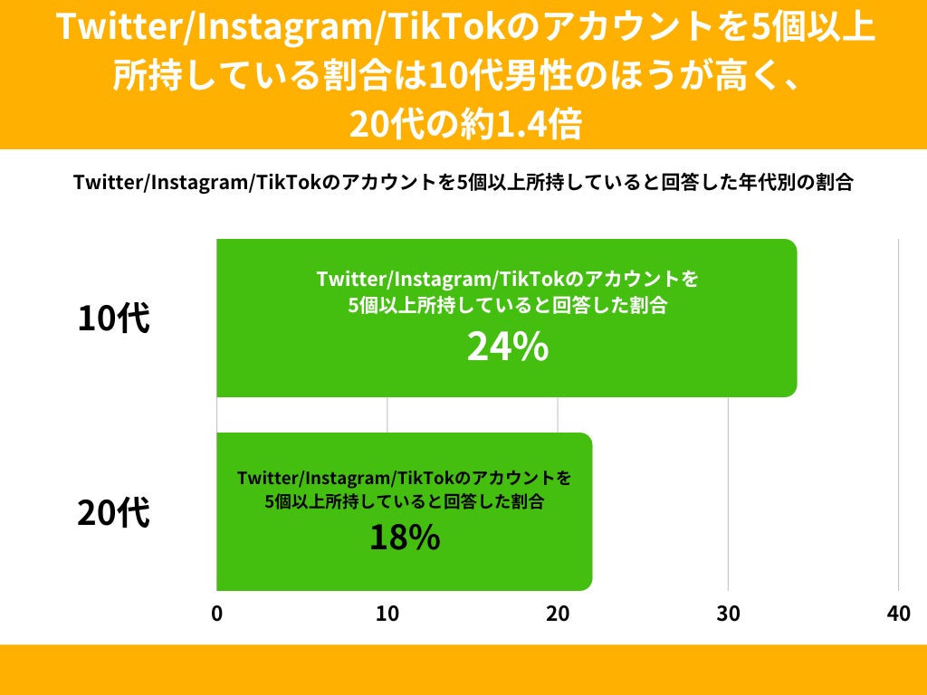 【Twitter/Instagram/TikTokのアカウントを5個以上所持している割合は10代男性のほうが高く、20代の約1.4倍】