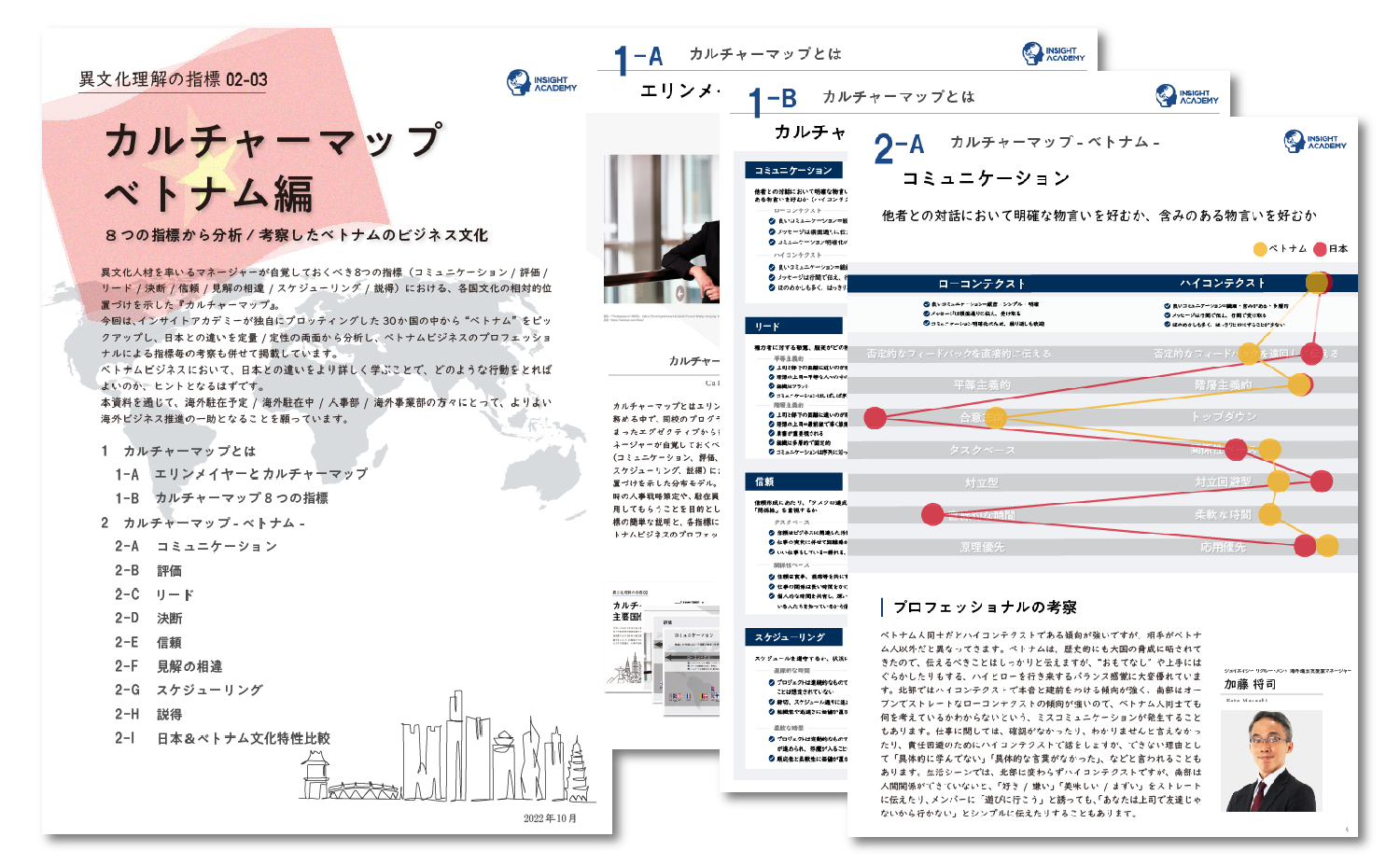 インサイトアカデミーでは、独自にプロッティングした65か国の中から、この度“ベトナム”をピックアップし、8つの指標を説明するとともに、日本との違いを定量 / 定性の両面から分析し、ベトナムビジネスのプロフェッショナルによる8つの指標毎の考察を盛り込んだ「国別カルチャーマップ ベトナム編」をリリースいたしました。