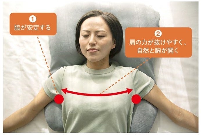 脱力まくらは、肩の力の抜きやすさにもこだわっています。胸を横方向から圧迫する「巻き肩」を解放するためのポイントは「脇」です。脇は、体幹を支え、強い姿勢を維持するために、脇は重要な役割を担っています。脱力まくらは、この脇をしっかり支えることで、安心して肩を開けるように、最大の特長である「アームホールドゾーン」を設けています。