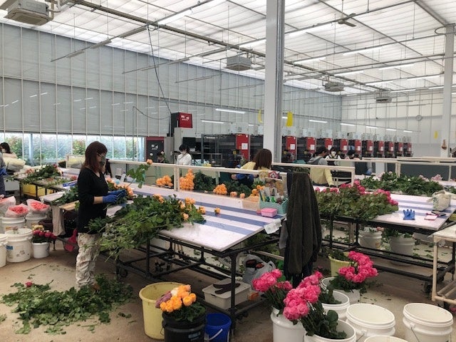 温室内はバラが強く美しく育つことができる“1年中、晴れた春の日”の状態を環境制御システムにより再現。土壌ではなくココピート(ヤシ殻培地)を採用して害虫の被害を抑え、選花機等による機械化も推進し、少ないスタッフで年間300万本の安定した生産量を実現しています。明るく広々とした快適な作業場で、地域の方々や海外出身スタッフなど多くの女性たちが活躍中です。
