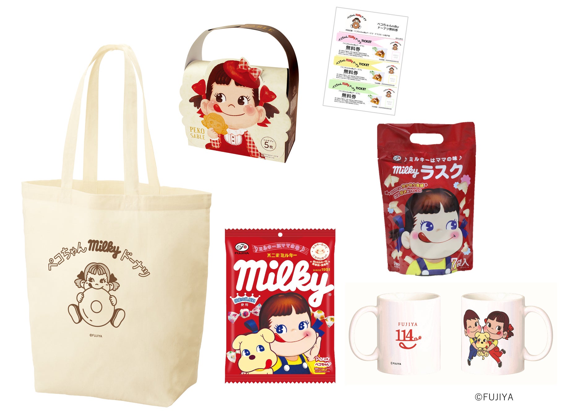 「ペコちゃんmilkyドーナツ」ロゴが入ったオリジナルのトートバッグに、「ペコサブレ」や不二家のお菓子、グッズを詰め合わせました。お得なドーナツクーポン付きです。