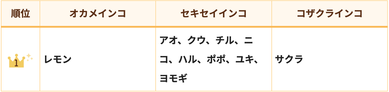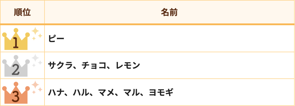 2位は「サクラ」「チョコ」「レモン」が同率となり、可愛らしさや親しみやすさを感じさせる名前が上位を占めました。