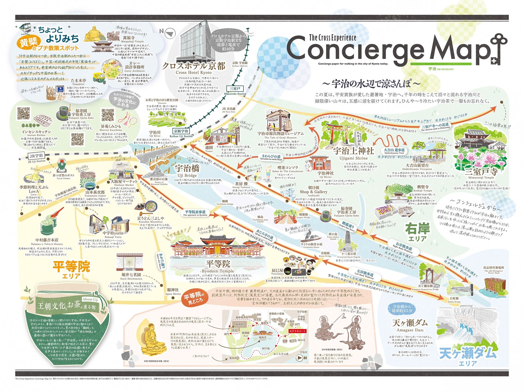 クロスホテル京都は、当ホテルから電車を使って30~60分ほどで行ける場所にスポットをあて、一歩踏み込んだ京都の新たな魅力をお伝えする情報紙「Cross Experience」を、年に3回のペースで発行しています。「Cross Experience - Concierge Map 宇治編」は、宇治の地元の皆さまにもご協力いただき制作し、充実の内容に仕上がっています。こちらを片手に、1日かけてじっくりと宇治を楽しんでみてはいかがでしょうか。