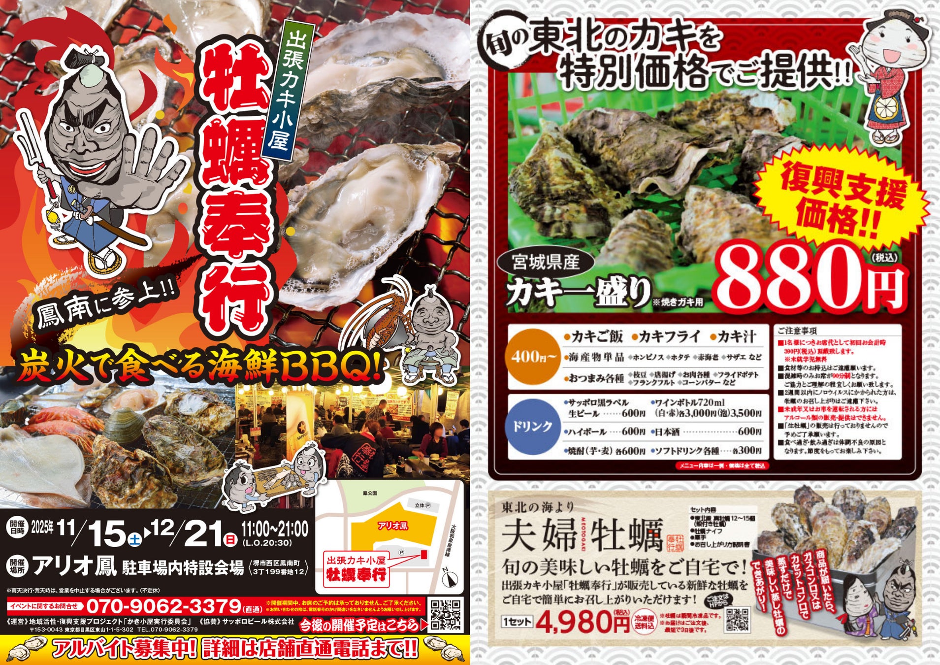 大阪府堺市に「出張カキ小屋」参上! アリオ鳳駐車場内特設会場で期間限定開催!《 宮城県産殻付き牡蠣が一盛り880円!! 》