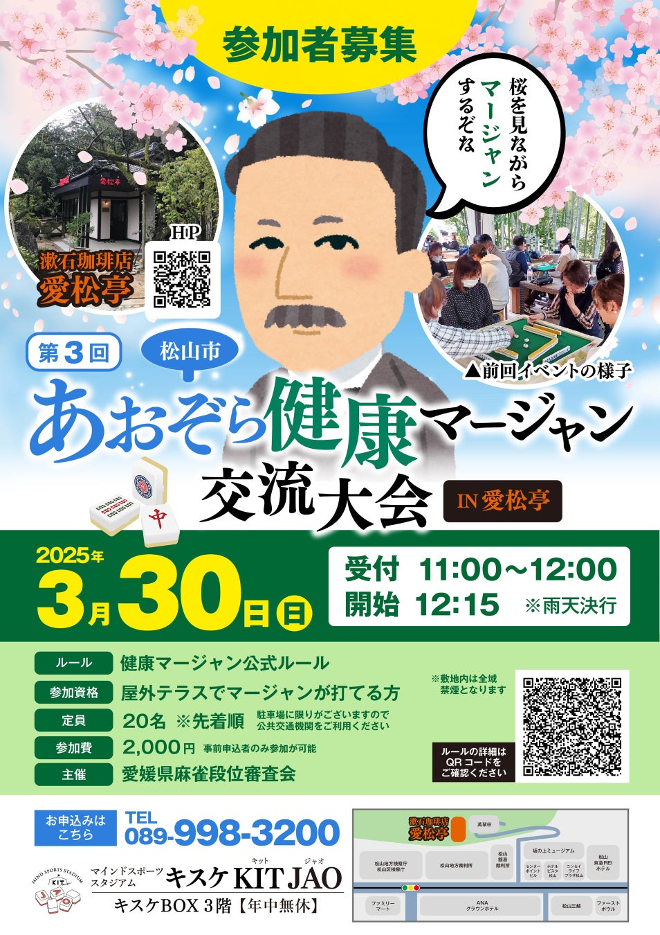 総合エンターテイメント企業・キスケ株式会社(本社:愛媛県松山市、代表:山路義則)が運営する「キスケ KIT JAO」(愛媛県松山市)は、萬翠荘指定管理者である株式会社ウイン(本社:愛媛県松山市、代表:村上道照)の協力のもと、萬翠荘付帯施設の愛松亭「漱石珈琲店」で、健康マージャン交流大会を再び開催いたします。前回、大好評を博した本イベントが、皆様の熱いご要望にお応えし、再び開催される運びとなりました。歴史と文化が融合した特別な空間で、世代を超えた交流を再びお楽しみいただけます。