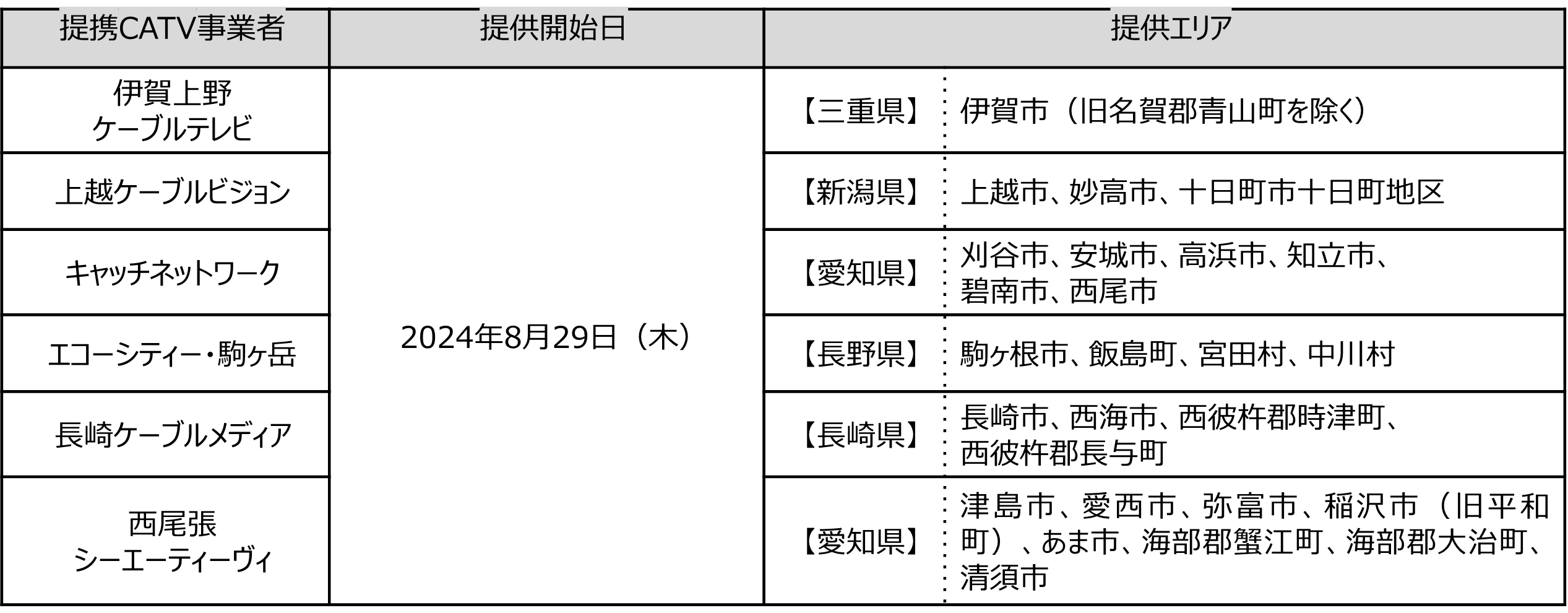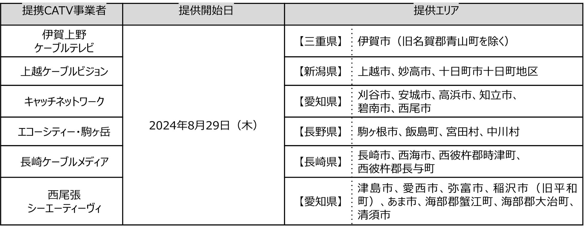 株式会社NTTドコモ(以下、ドコモ)は、2024年3月1日(金)から提供開始している光インターネットサービス「ドコモ光 10ギガ タイプC」において、対象となる提携ケーブル事業者(以下、提携CATV事業者)に、2024年8月29日(木)から伊賀上野ケーブルテレビ株式会社(以下、伊賀上野ケーブルテレビ)、上越ケーブルビジョン株式会社(以下、上越ケーブルビジョン)、株式会社キャッチネットワーク(以下、キャッチネットワーク)、株式会社エコーシティー・駒ヶ岳(以下、エコーシティー・駒ヶ岳)、株式会社長崎ケーブルメディア(以下、長崎ケーブルメディア)、西尾張シーエーティーヴィ株式会社(以下、西尾張シーエーティーヴィ)の6社を追加します。今回の提携により、「ドコモ光 10ギガ タイプC」の提携CATV事業者は全国で17社となります。
