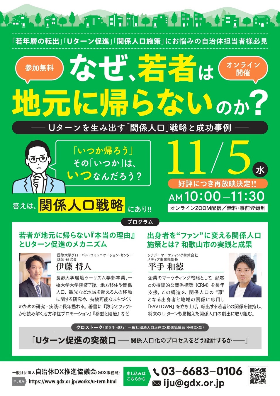 一般社団法人自治体DX推進協議会(所在地:東京都港区、以下GDX)は、多くの自治体が直面する「若年層の転出」や「Uターン促進」の課題解決の鍵となる「関係人口」戦略に焦点を当てたオンラインセミナー「なぜ、若者は地元に帰らないのか? 〜Uターンを生み出す『関係人口』戦略と成功事例〜」を、多数のご要望にお応えし、本日よりアーカイブ配信の申し込み受付を開始いたします。