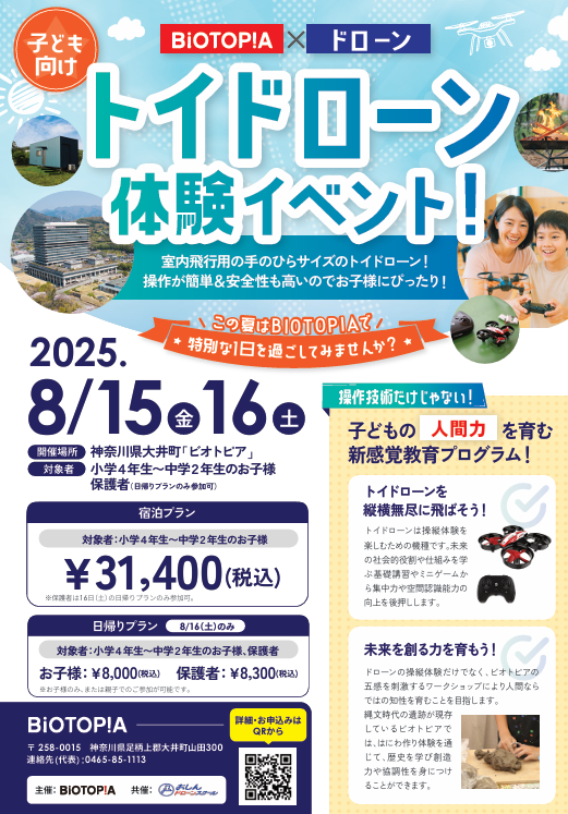 ビオトピアを運営する株式会社ブルックスホールディングス(※1本社:神奈川県横浜市青葉区美しが丘4-54-6、代表取締役:小川裕子)及び株式会社おしんドリーム(※2)は2025年8月15日(金)・16(土)に【トイドローン体験イベント~「未病×ドローン」で子どもたちの「未来を創る力」を育む~】を実施します。