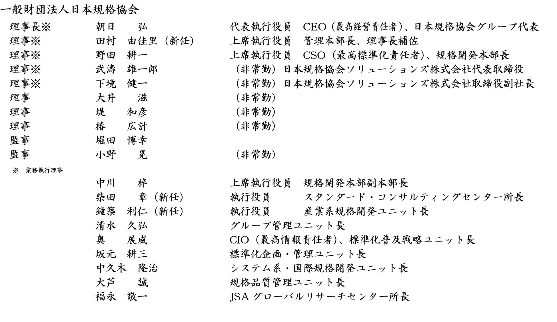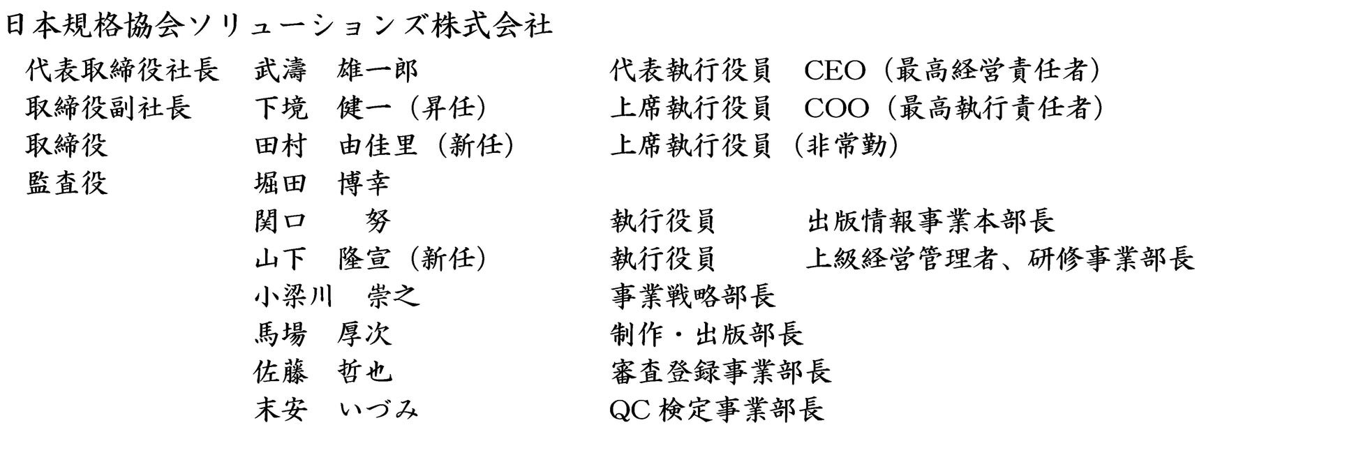このたび日本規格協会グループは、グループ各法人の新しい経営体制を下記のとおり決定いたしました。新体制のもと、役員・従業員一同、より一層のサービス向上に努めてまいりますので、今後とも変わらぬご支援を賜りますよう、宜しくお願い申し上げます。