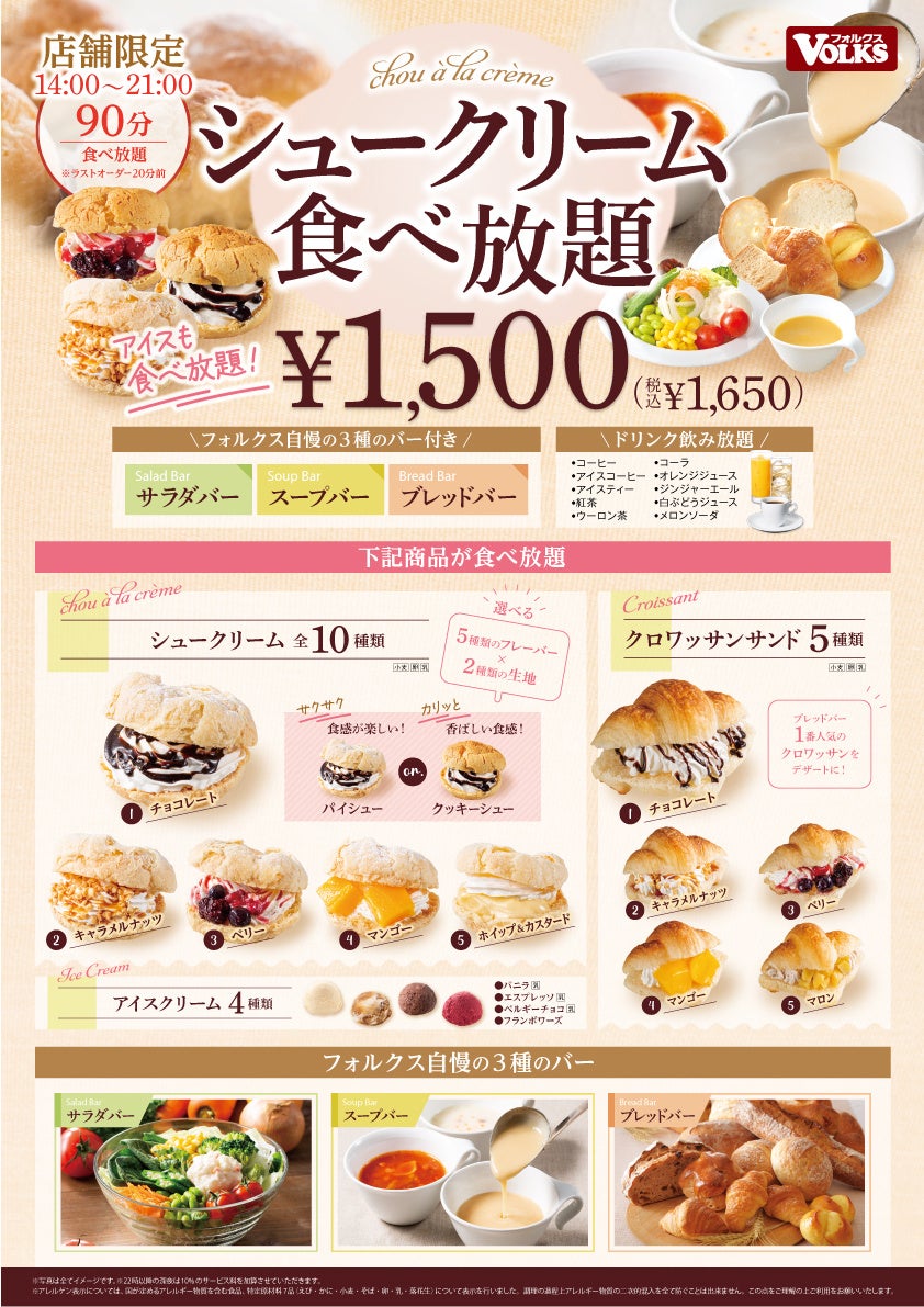 店舗で焼き上げた2種類のシューはしっかりした食感が本格派の香ばしさ。さらに焼き立てパンの中でも1番人気のクロワッサンを使用したクリームサンド、4種類のアイスも食べ放題のスイーツ好き必見!の内容になっております。フォルクスお気に入りの理由として必ず挙がるサラダ・スープ・焼き立てパンのバーもあわせて食べ放題とし、ゆったりとした店内でお過ごしいただく楽しさを満喫できるイベントです。
