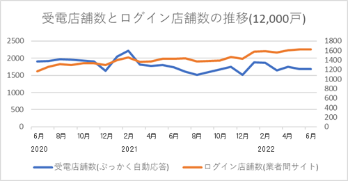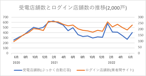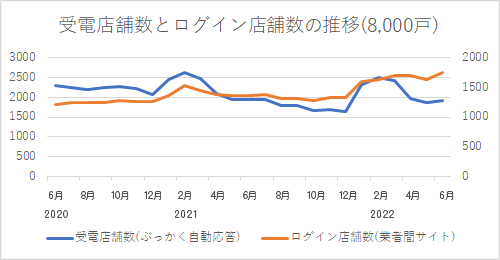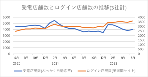 「ぶっかく自動応答」と「業者間サイト」を並行して2年以上活用している3社を抽出し、「ぶっかく自動応答」及び「業者間サイト」の利用店舗数を集計しました。「ぶっかく自動応答」は、1ヶ月間で1回以上自動音声を利用した仲介業者数(複数回利用した場合も1カウント)、「業者間サイト」は1ヶ月にログインした仲介業者数(複数回利用した場合も1カウント)をそれぞれ指標としました。