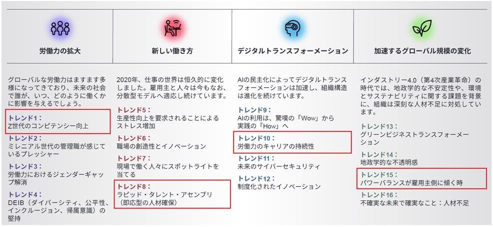 こうした環境の変化を踏まえ、今後の働き方に影響を与える16の主要トレンドに基づき、企業や組織が将来の労働力戦略を策定するための指針を提供します。2025年以降を見据え、特に注目すべきトレンドについて、『労働力への影響』とあわせて詳しく説明していきます。