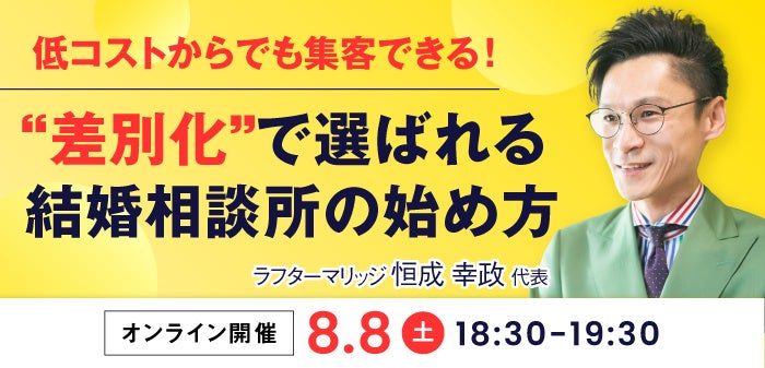福岡市内で相談所を運営し、その人柄と手厚いサポートで成婚を出し続けている、ラフターマリッジ 恒成 幸政先生(https://laughmari.com/) より、低コストからでも集客できる!“差別化”で選ばれる結婚相談所の始め方についてお伝えいただきます。
