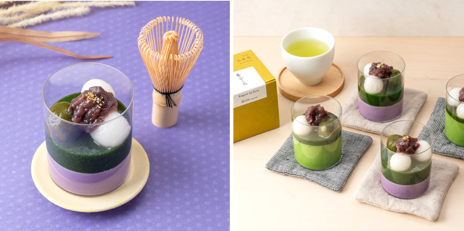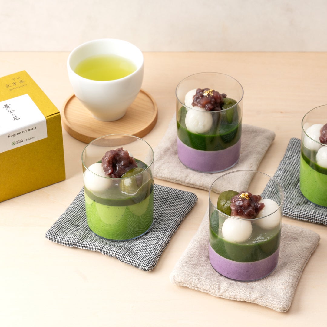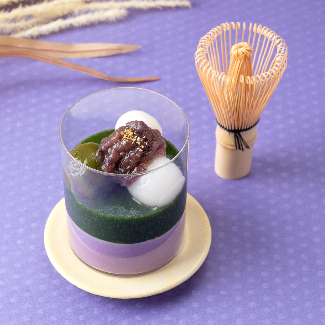 祇園辻利が厳選する抹茶を贅沢に使用した濃厚な抹茶の「ジュレ」と、コク深く紫いもならではの優しい甘さの「紫いもムース」の2層仕立てにして、「白玉」「小豆」をトッピングした和スイーツ。もっちり食感の「白玉」と祇園辻利の抹茶を練り込んだ「抹茶白玉」、むうすに合うようにブレンドした、上品な甘さ控えめの「つぶあん」をたっぷり添えて、仕上げに華やかに煌めく「金粉」をあしらいました。