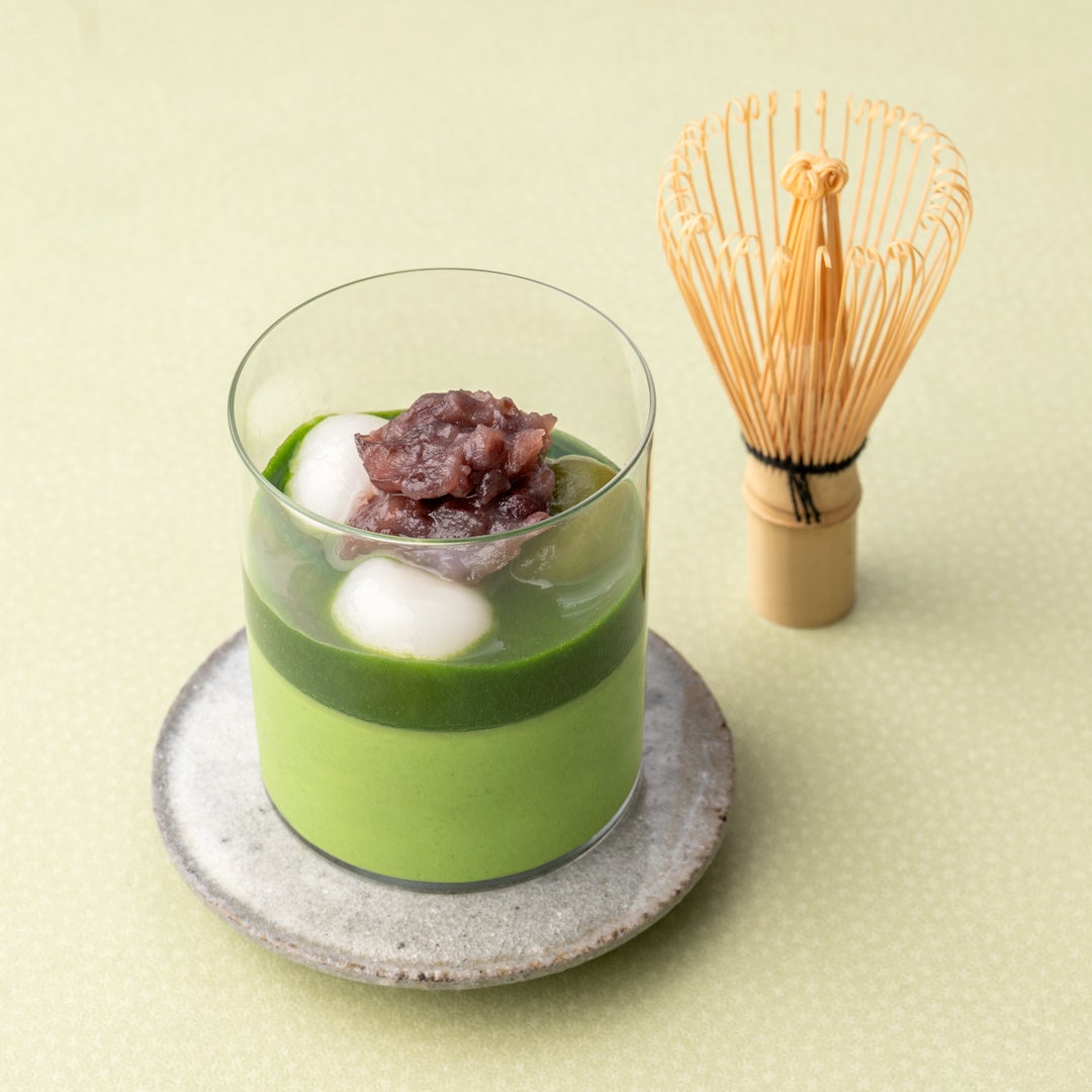 宇治茶専門茶寮ならではの上品なお茶の風味をしっかりと感じられる優しいムースに、濃厚な抹茶の風味が突き抜ける特製の「ジュレ」やホイップと2層仕立てにして、「白玉」「小豆」をトッピングした和スイーツ。もっちり食感の「白玉」と祇園辻利の抹茶を練り込んだ「抹茶白玉」、むうすに合うようにブレンドした、上品な甘さ控えめの「つぶあん」をたっぷり添えているので、最後の一口まで茶寮都路里“定番の味”をお楽しみいただけます。