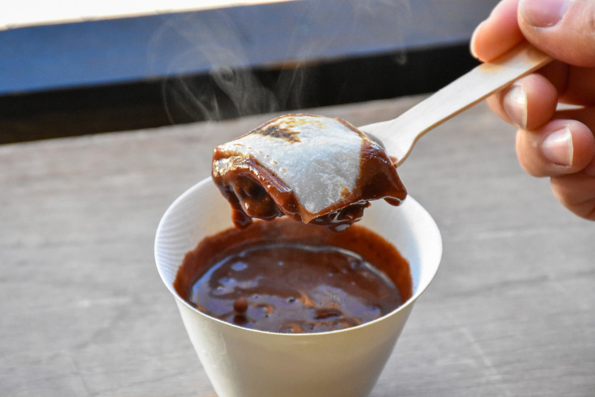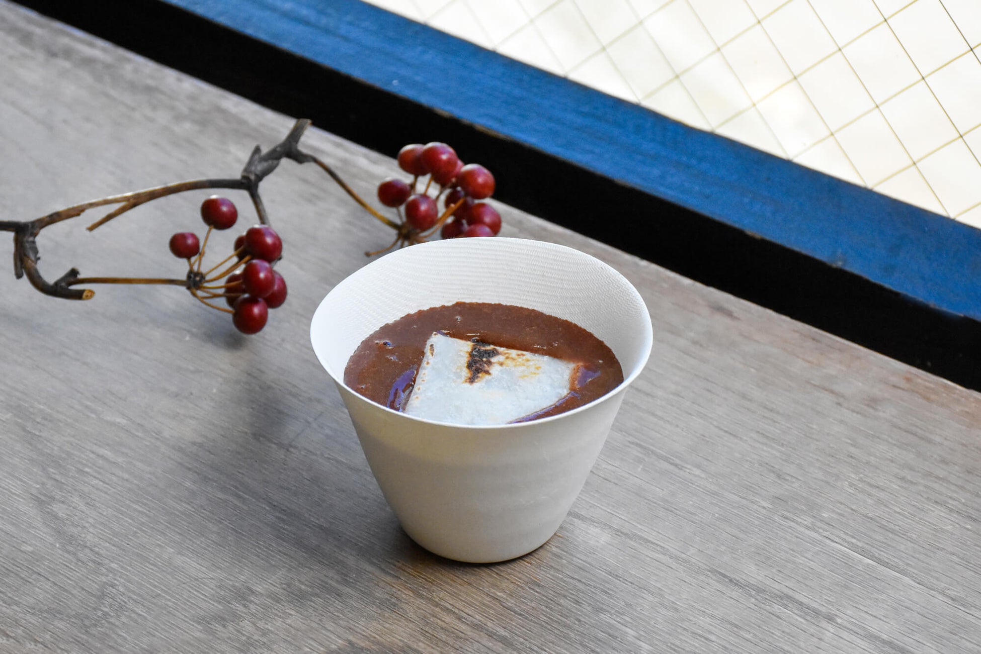 そこにこんがり焼いた薄いお餅を入れた、寒い季節にぴったりな温かく満足感のあるチョコレートぜんざいです。