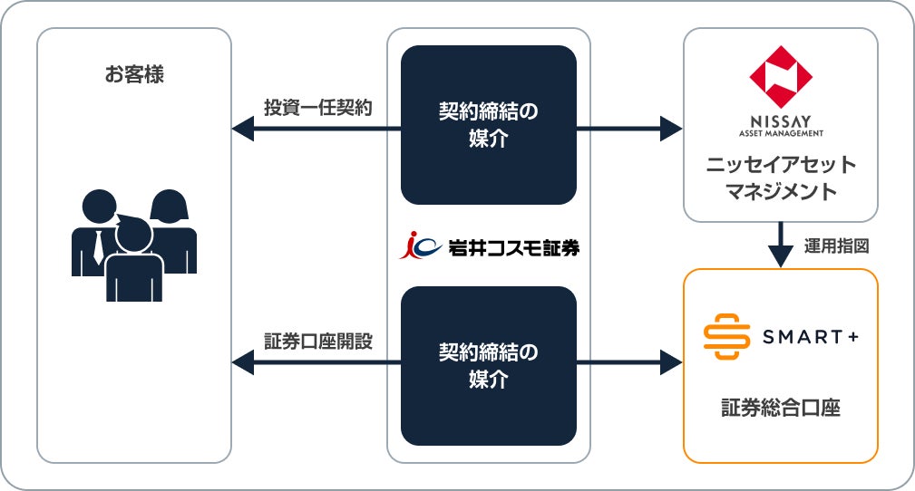 なお、「岩井コスモ・ゴールナビ」は、ニッセイアセットマネジメントが投資一任業者として運用の指図を、岩井コスモ証券が投資一任締結契約の媒介を、スマートプラスが証券口座管理を行います。