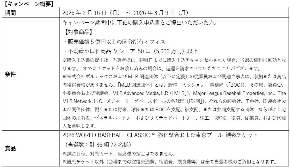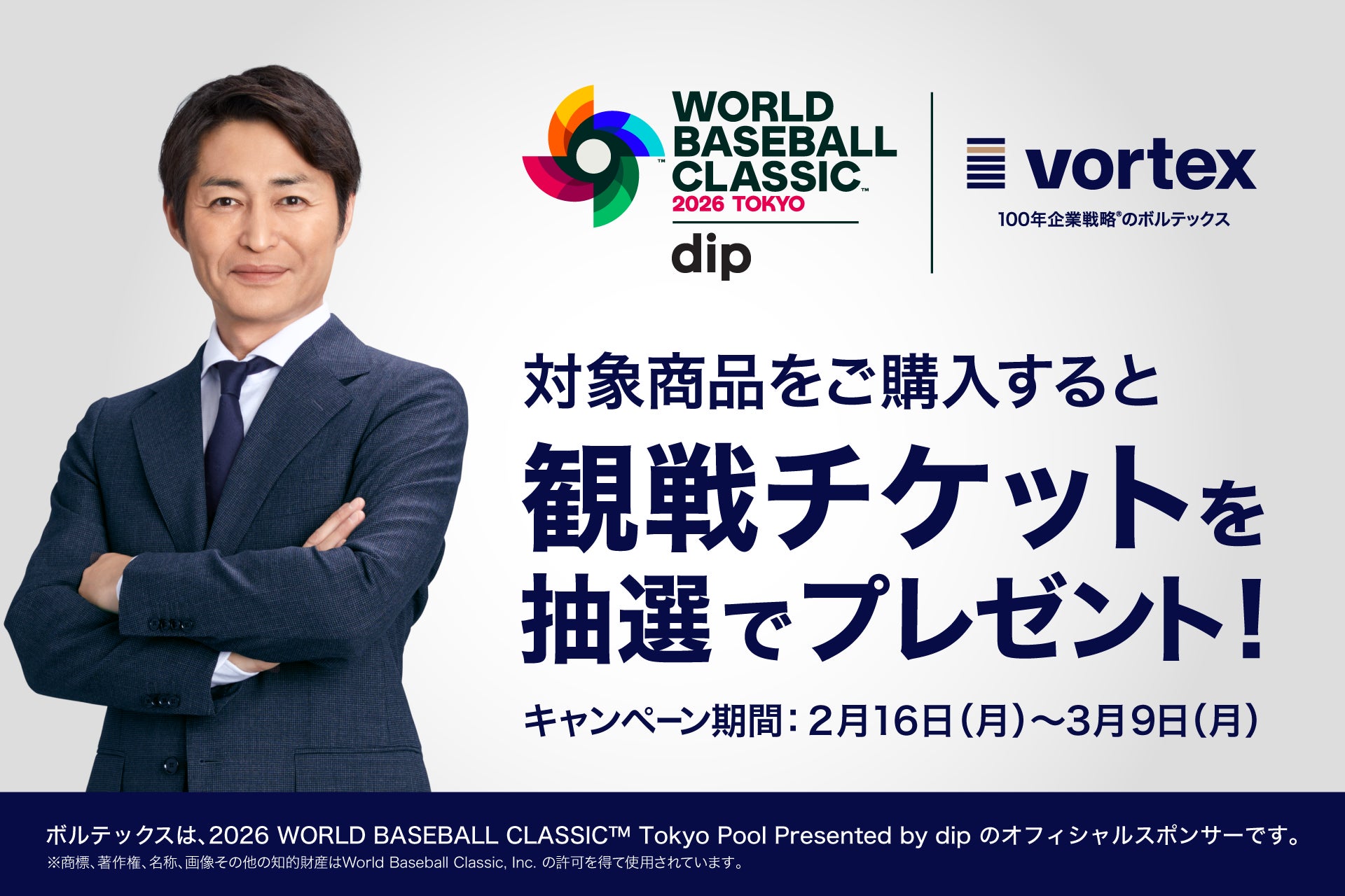 「区分所有オフィス®」を主軸に資産形成コンサルティングを行う株式会社ボルテックス(東京都千代田区 代表取締役社長 兼 CEO 宮沢 文彦、以下当社)は、2026 WORLD BASEBALL CLASSIC™ Tokyo Pool Presented by dip (以下、本大会)の オフィシャルスポンサー就任に伴い、「2026 WORLD BASEBALL CLASSIC™ 観戦チケットプレゼントキャンペーン」を実施いたします。
