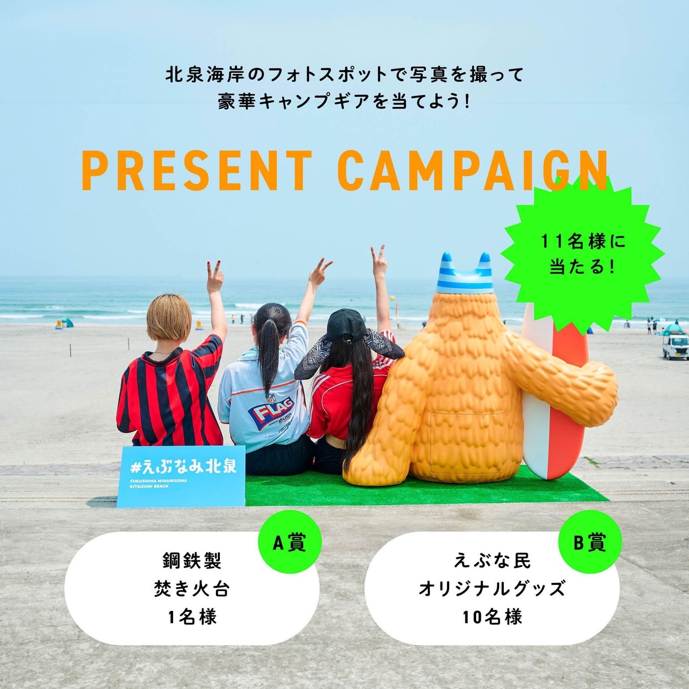 北泉海岸の公式キャラクターえぶな民(みん)の一員である「サタジャ」と一緒に写真が撮れるフォトスポットが誕生。公式Instagramでは、7月13日〜8月18日の海開き期間中、現地で撮影した画像に「#サタジャの背中」をつけて投稿するとキャンプギアが当たるキャンペーンも開催中。