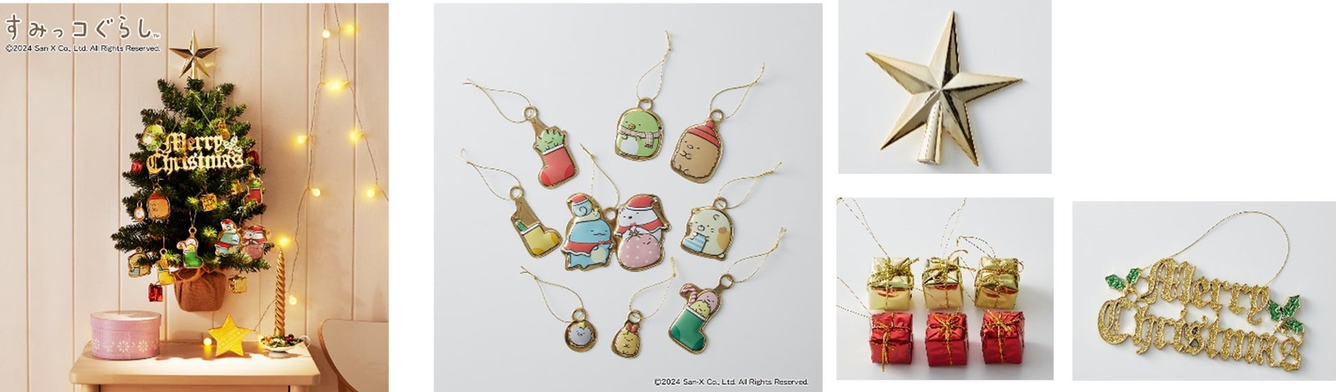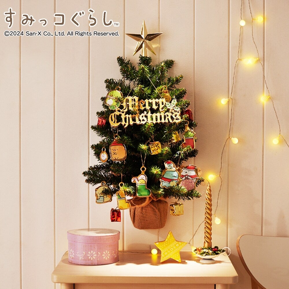 サンタクロースやクリスマスデザインに扮したキャラクターたちが魅力的な、「すみっコぐらし」のオーナメント付きクリスマスツリーが新登場しました。4種類のクリスマスデザインのオーナメントが、あたたかなクリスマスの雰囲気を演出します。壁掛け仕様で場所を取らないため、リビングや子ども部屋など、様々な場所に手軽に飾ることができ、収納もストレス無く行えます。