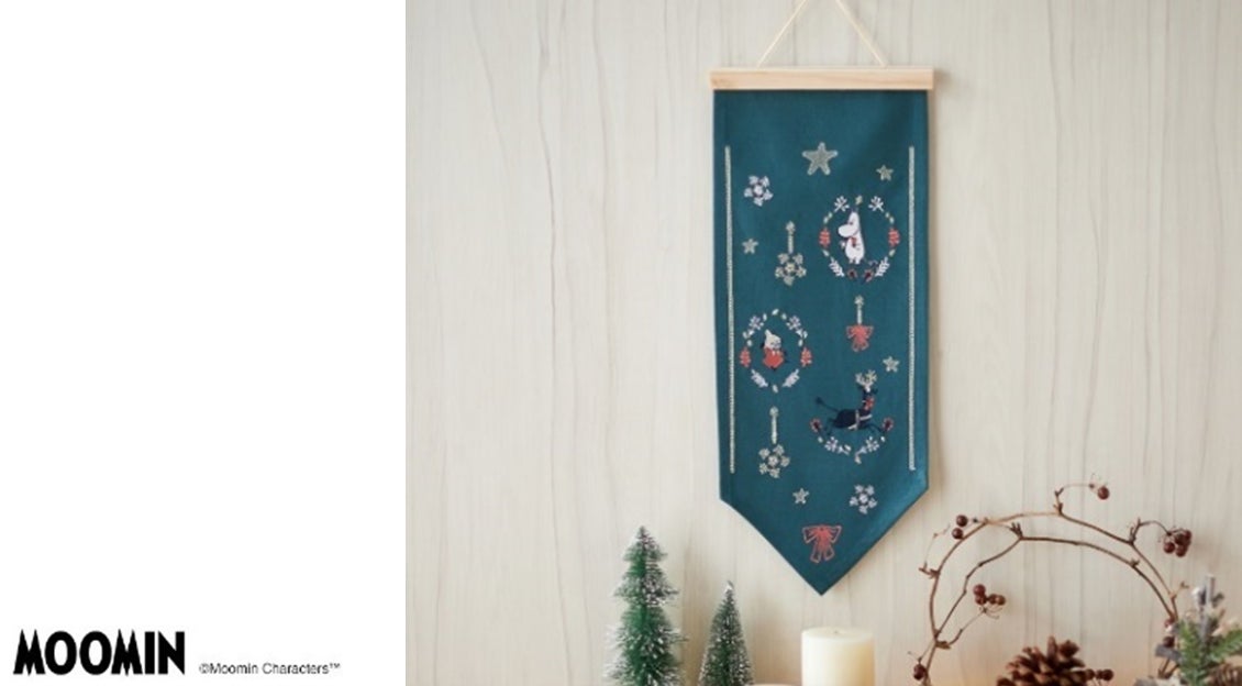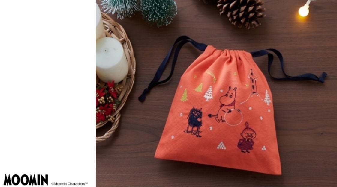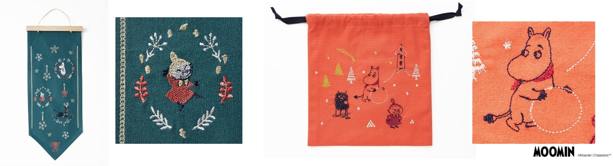 ムーミンの物語が生まれた北欧では、伝統的なイベントとしてクリスマスマーケットが開催されます。クリスマスグッズを少しずつ集めてクリスマスまでの準備期間を楽しむといった北欧の暮らしを意識し、手作り感とあたたかみがあるアイテムを開発しました。飾るだけでクリスマスの雰囲気を楽しめる「吊り下げ棒付きクリスマスタペストリー」と、キャラクターの表情や細部のディテールまでこだわり、刺繍で精巧に再現した「刺繍入り巾着」をラインアップしています。