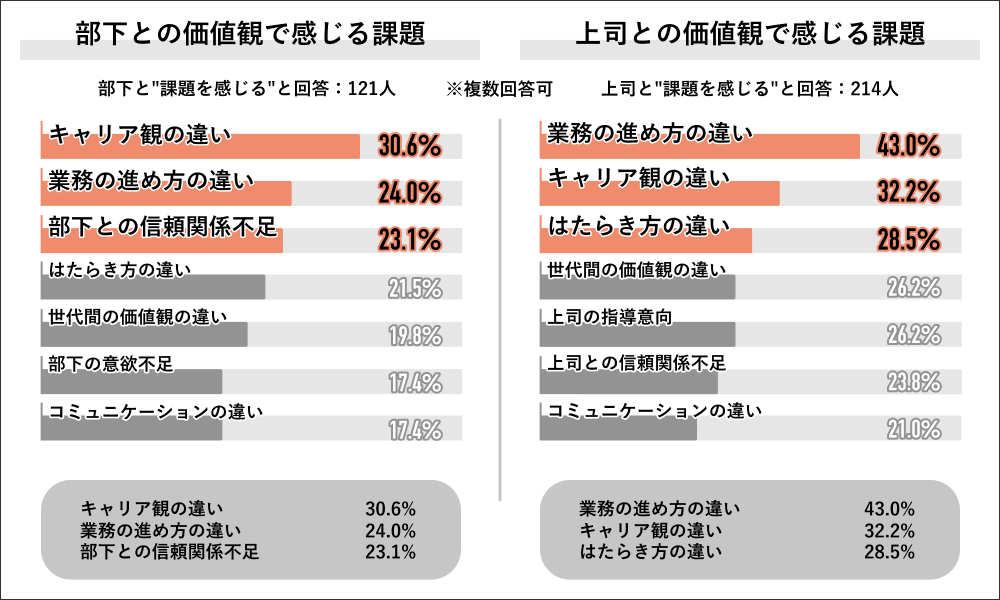 部下と価値観の違いから生じる課題を感じると回答した121人にその内容を聞くと、「キャリア観の違い」が30.6%で最多となり、次いで「業務の進め方の違い」が24.0%、「部下との信頼関係不足」が23.1%となりました。上司と価値観の違いから生じる課題を感じると回答した214人にその内容を聞くと、「業務の進め方の違い」が43.0%で最多となり、次いで「キャリア観の違い」が32.2%、「はたらき方の違い」が28.5%となりました。