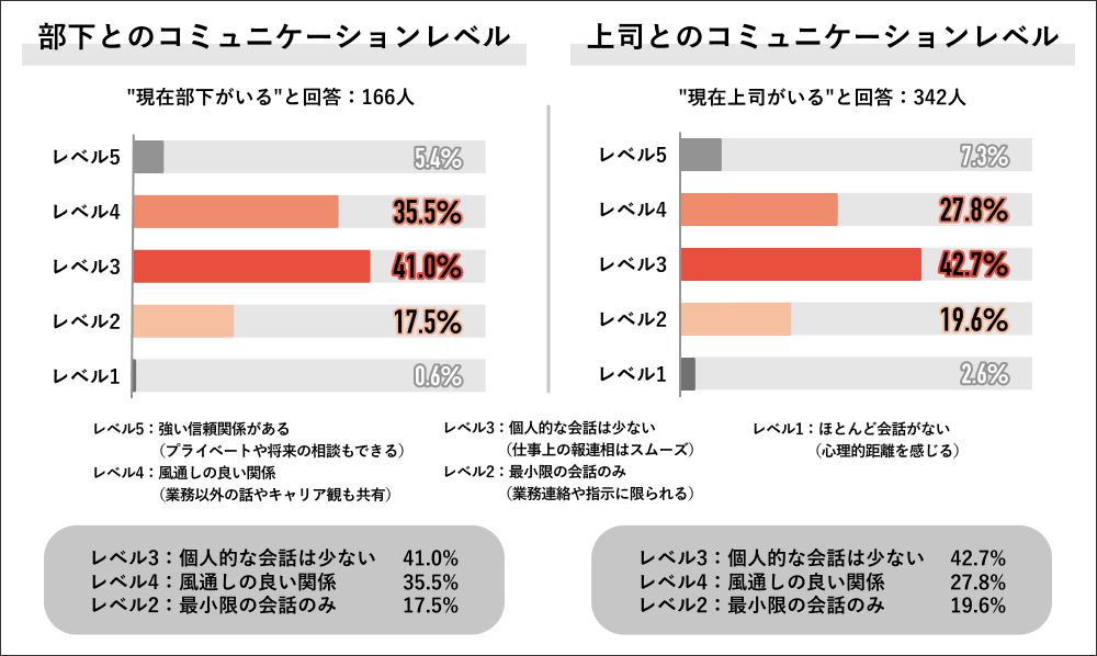 同様に、現在上司がいる342人に、上司とのコミュニケーションレベルを聞くと、「レベル3:個人的な会話は少ない」が42.7%と多数を占め、次いで「レベル4:風通しの良い関係」が27.8%、「レベル2:最小限の会話のみ」が19.6%となりました。