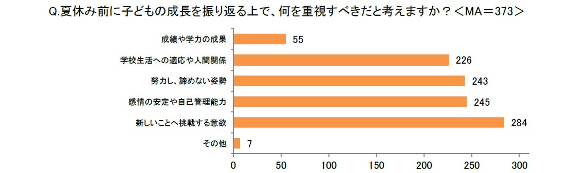 非認知能力を育むために家庭で意識していることとして、「子どもが興味を持つことや、新しい挑戦に対する応援の姿勢」(291)、「結果よりも努力や工夫を褒めること」(254)、「子どもの話をよく聞き、共感すること」(272)など、それぞれの取り組みに意見が分かれました。また、「夏休み前に子どもの成長を振り返る上で、何を重視すべきだと考えますか?<MA>」に対しては、「成績や学力の成果」(55)は最も低く、「新しいことへ挑戦する意欲」(284)が最も多い回答数であることから、“夏休み期間の非認知能力の向上”を期待している親が多いことが考えられます。