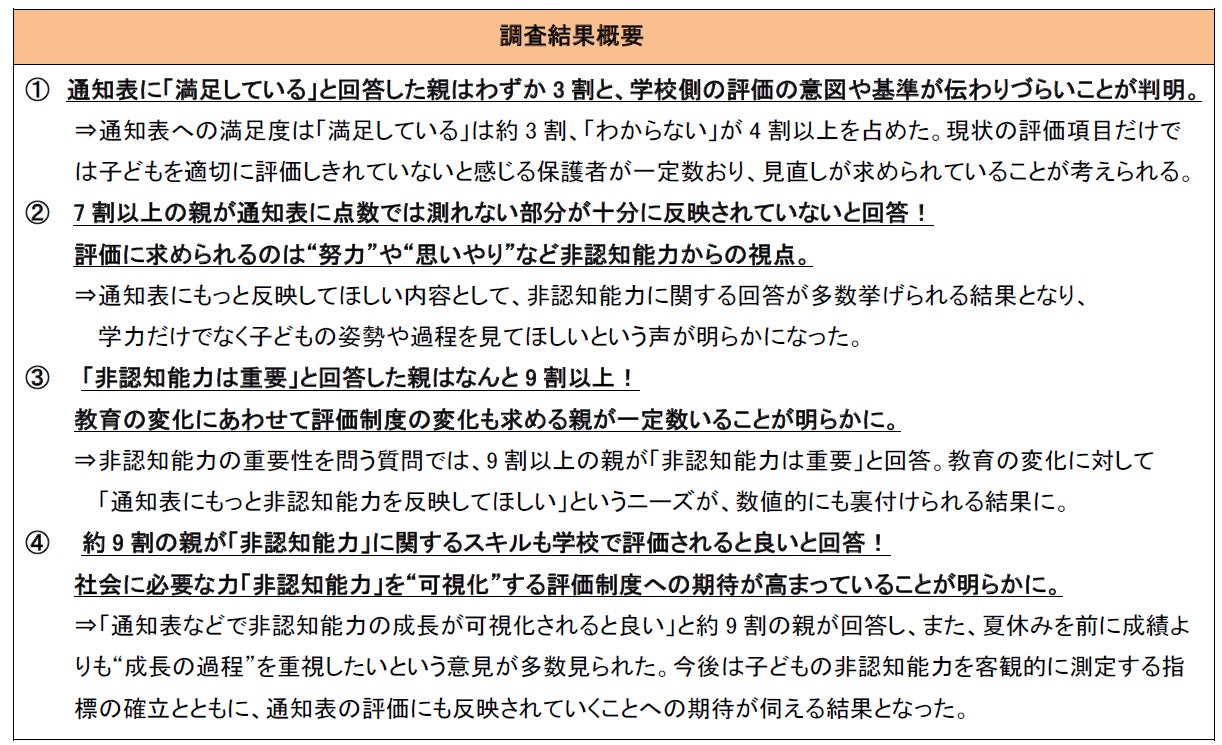 “努力”や“思いやり”など非認知能力からの視点を評価に求める親が多いことが判明。