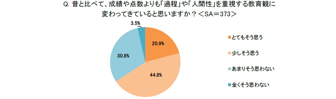 また、「昔と比べて、成績や点数よりも『過程』や『人間性』を重視する教育観に変わってきていると思いますか?<SA>」という問いに対しては、「とてもそう思う」(78)、「少しそう思う」(167)を合わせた回答が6割以上という結果になりました。通知表に反映してほしい項目や、非認知能力に注目が集まっているという調査結果を踏まえると、教育の変化に対して通知表や学校での評価制度も変わるべきであると考えている親が一定数いるということが示唆されました。