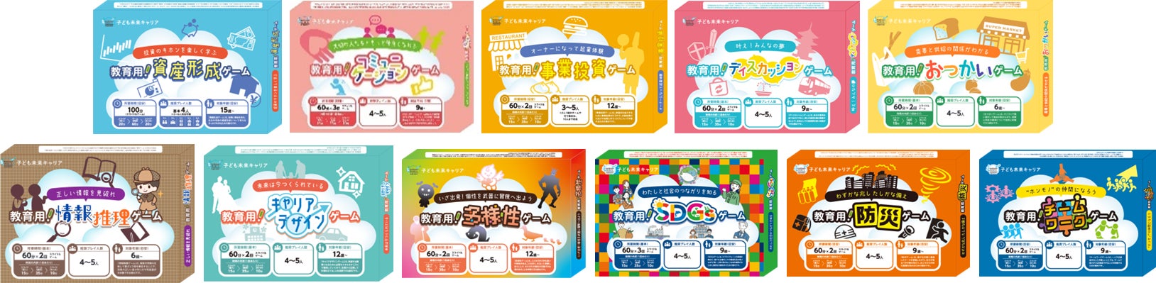 『子ども未来キャリア』は、子どものときから夢や目標を持ち、グローバル社会で必要となる知識と能力を育む、キャリア教育用ボードゲーム教材です。ボードゲームを通じた疑似体験と、スライド教材を活用した学習を組み合わせた「遊び×学び」を融合した内容で、主体的に楽しく学ぶことができます。