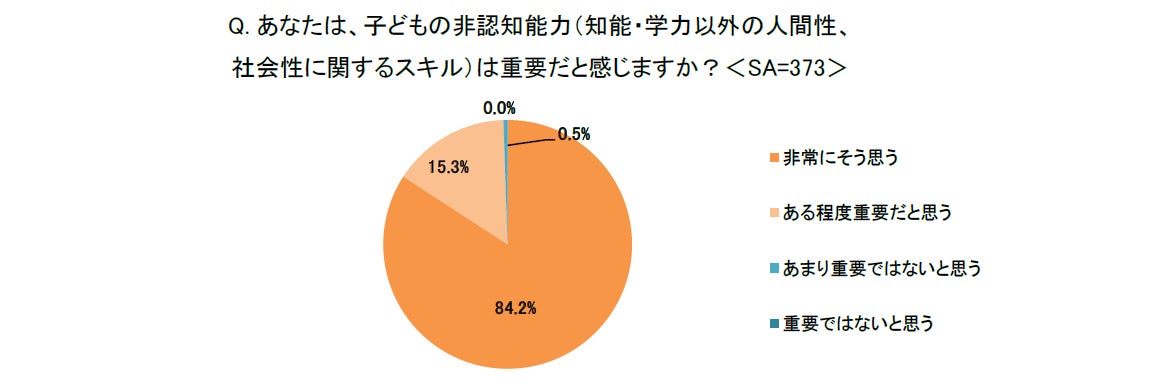 「あなたは、子どもの非認知能力(知能・学力以外の人間性、社会性に関するスキル)は重要だと感じますか?<SA>」の質問に対して、「非常に重要だと思う」(314)、「ある程度重要だと思う」(57)と9割以上が回答し、“学力以外の力”に注目が集まっていることがわかる結果となりました。前述の結果とあわせると、非認知能力の注目が集まりつつある中、その力が評価として可視化されていない現状とのギャップに多くの保護者が課題感を感じていることが明らかとなりました。