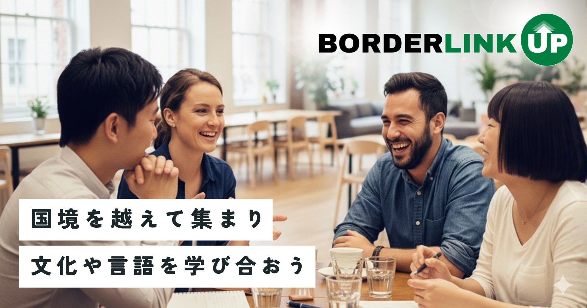 「BORDERLINK UP」は、当社の社名「BORDERLINK(ボーダーリンク)」と「link up(リンクアップ=合流する、つながる)」を組み合わせた造語で、「国境を越えて人々が集い、文化や言語を学び合える場」という想いが込められています。