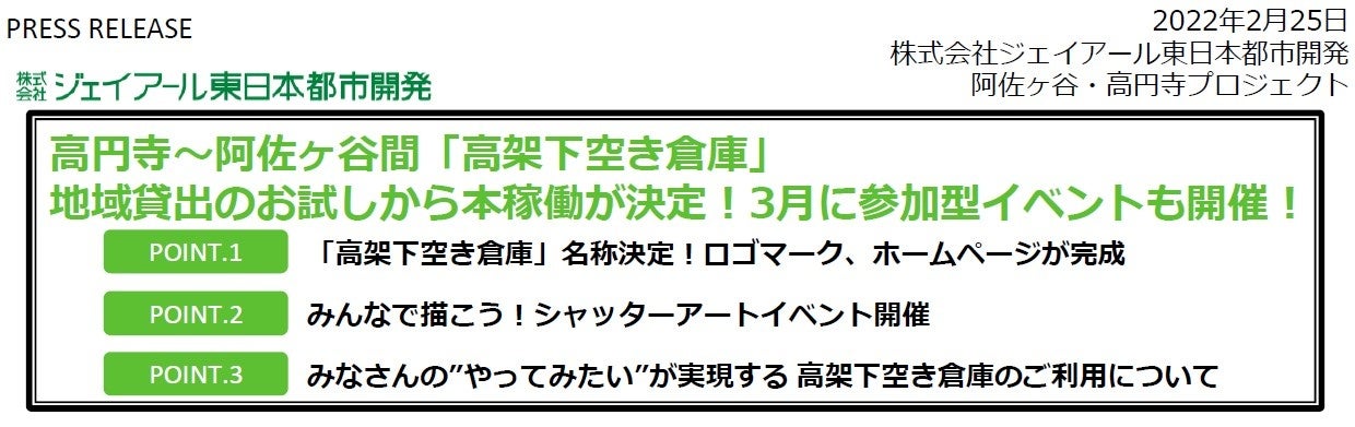 高円寺~阿佐ヶ谷間「高架下空き倉庫」 地域貸出のお試しから本稼働が決定!3月に参加型イベントも開催!